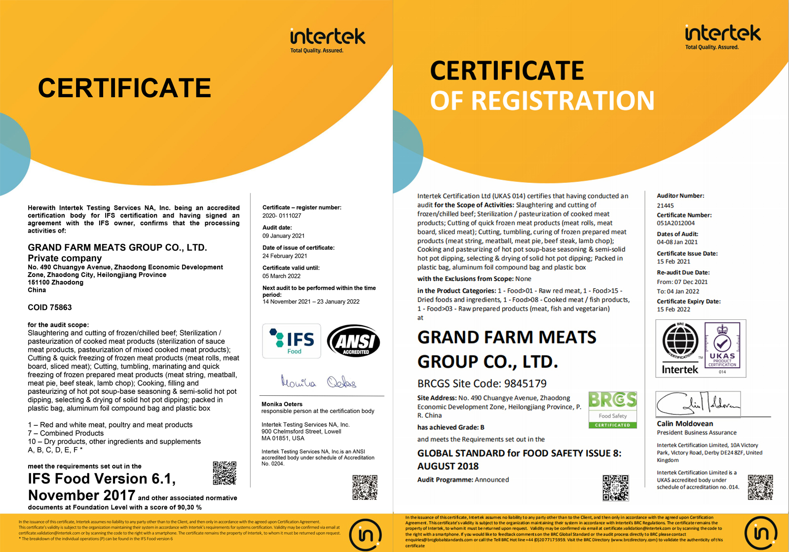 2021年1月,通過歐洲國際雙體系質量認證(BRCGS、IFS)。